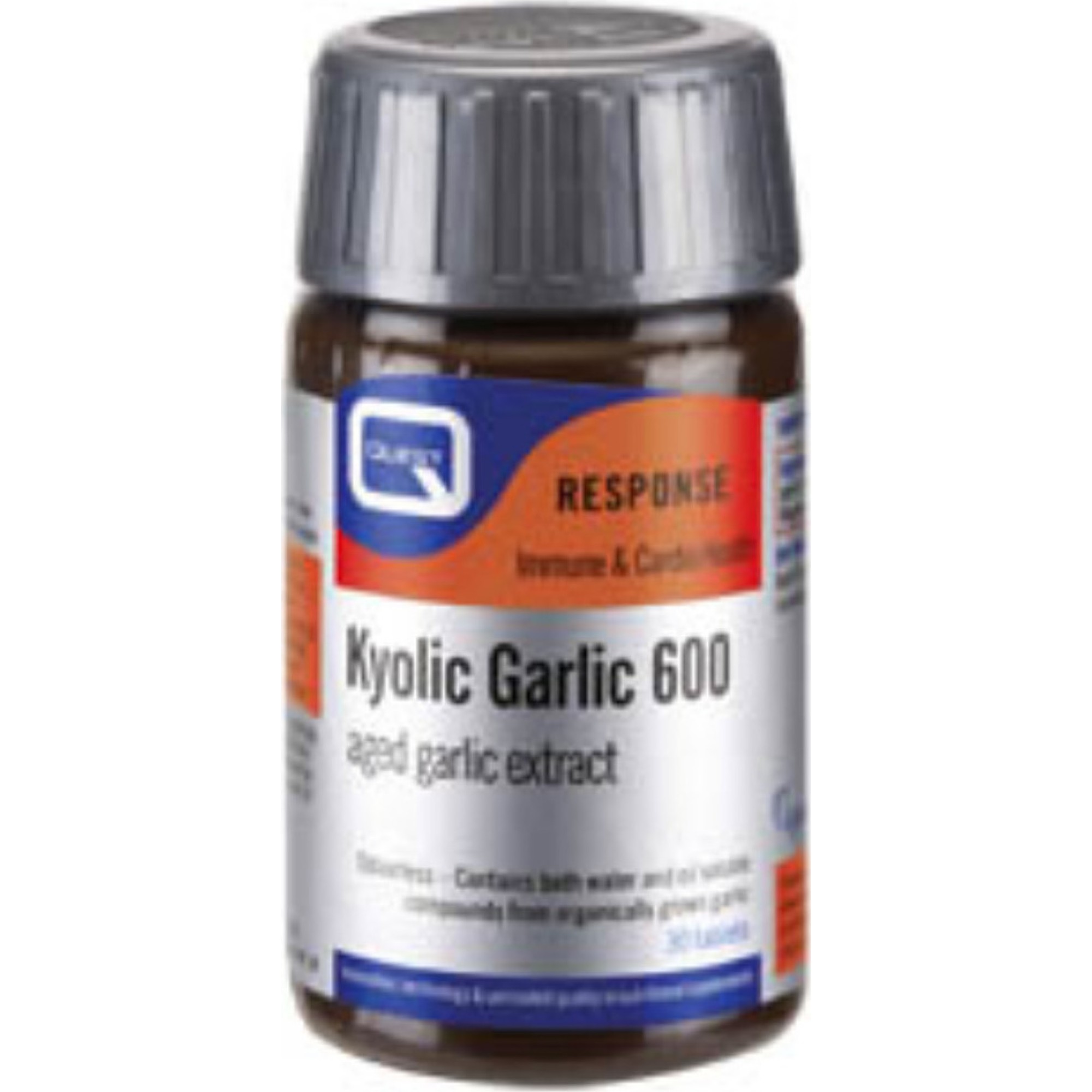 Το Kyolic Garlic 600mg Aged Garlic Extract της Quest παρέχει σημαντική υποστήριξη στο καρδιαγγειακό και ενίσχυση στο ανοσοποιητικό. Μειώνει τον κίνδυνο καρδιαγγειακών παθήσεων, διατηρεί τη χοληστερόλη σε καλά επίπεδα και μειώνει τα τριγλυκερίδια. Είναι ένα μοναδικό και αποτελεσματικό αντιοξειδωτικό και συμβάλλει στην αποτοξίνωση του ήπατος. Επίσης, βελτιώνει τη λειτουργία της μνήμης, ενισχύει τη σωματική δύναμη, μειώνει το άγχος και την κόπωση και έχει αντιμικροβιακές ιδιότητες. Χαρακτηριστικά Σύνθεσης  - Το σκόρδο είναι βιολογικής καλλιέργειας  - Το σκόρδο ψυχρής ωρίμανσης είναι άοσμο  - Περιέχει υδατοδιαλυτά και λιποδιαλυτά συστατικά  - Η μέχρι 20 μήνες διαδικασία ψυχρής ωρίμανσης δίνει τη δυνατότητα να παραχθεί μια πληθώρα φυσικά παρουσιαζόμενων θρεπτικών συστατικών, πολλά από τα οποία είναι μοναδικά στο σκόρδο ψυχρής ωρίμανσης Kyolic  - FDA αξιολόγηση για ασφάλεια, σταθερότητα & τυποποίηση  - Τυποποιείται σε s-allyl cysteine  - Κατάλληλο για χορτοφάγους και vegans  Δοσολογία & Οδηγίες Χρήσης  Μια ή δύο ταμπλέτες την ημέρα με το φαγητό.  Θρεπτική Αξία  Μια ταμπλέτα παρέχει: Εκχύλισμα Σκόρδου Ψυχρής Ωρίμανσης 600mg   Έκδοχα  Μικροκρυσταλλική κυτταρίνη (πληρωτικό και συνδετικό υλικό)  Στεατικό μαγνήσιο (λιπαντικό υλικό)  Διοξείδιο του πυριτίου (διολισθητικός παράγοντας)  Υδροξυπροπυλομεθυλοκυτταρίνη (παράγοντας επίστρωσης)  Δεν περιέχει  Υδρογονωμένα λίπη, ζωικές ουσίες, συνθετικά συντηρητικά, χρώματα και αρωματικές ουσίες, προστιθέμενο άμυλο, σουκρόζη, λακτόζη ή αλάτι, μαγιά, σίτο ή γλουτένη. Περιέχει τα παρακάτω συστατικά: Εκχύλισμα σκόρδου ψυχρής ωρίμανσης, σκόρδο Πηγή: www.douni.gr