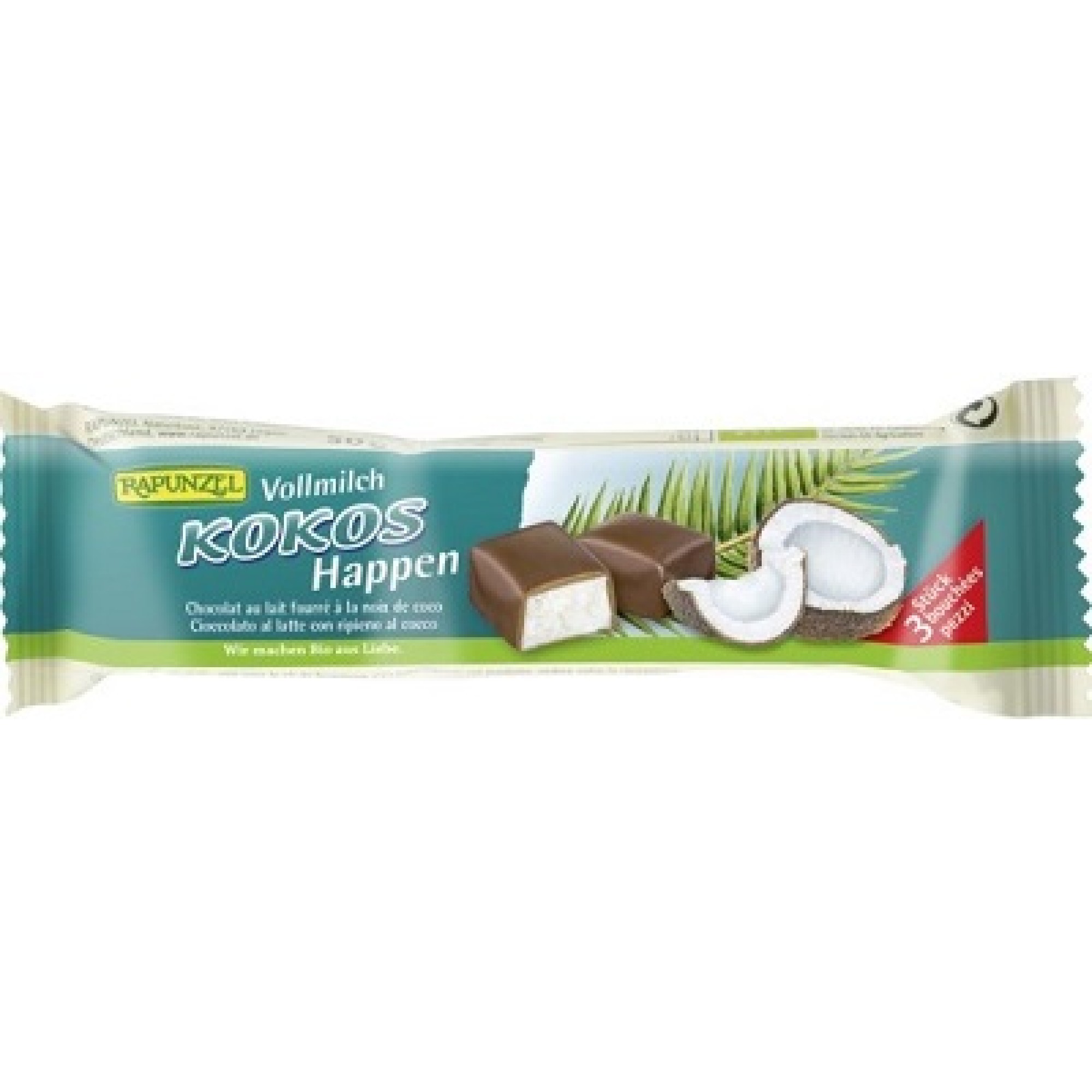 Συστατικά: καρύδα τριμμένη* (36%), σοκολάτα γάλακτος*(25%) (ακατέργαστη ζάχαρη ζαχαροκάλαμου*, βούτυρο κακάο*, γάλα πλήρες σκόνη*, κακαόμαζα*. Κακάο: τουλάχιστον 41%), σιρόπι ρυζιού*, σιρόπι αγάβης*, αλεύρι ρυζιού ολικής*, σιρόπι ρυζιού σε σκόνη* (σιρόπι ρυζιού*, ηλιέλαιο*, αλάτι).