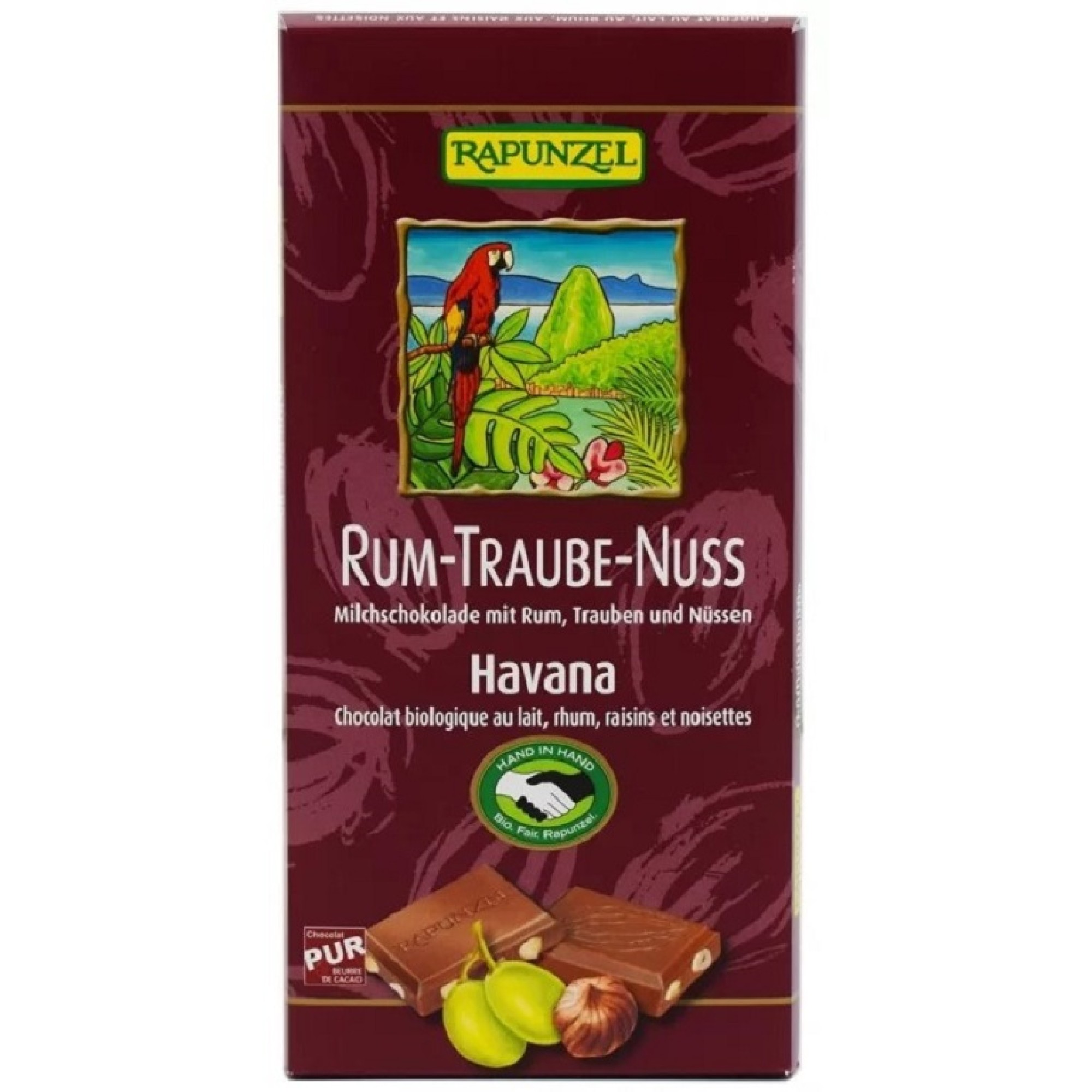 Η σοκολάτα γάλακτος με ρούμι και βανίλια bourbon, σταφίδες και φουντούκι, είναι η ιδανική επιλογή για τους λάτρεις της σοκολάτας. Άκρως γευστική και αρωματική, θα γίνει το αγαπημένο σας γλυκό σνακ που θα σας συντροφεύει κάθε στιγμή της ημέρας. Η παρασκευή της ακολουθεί την ελβετική παράδοση και περιέχει συστατικά δίκαιου εμπορίου, βιολογικής γεωργίας.
