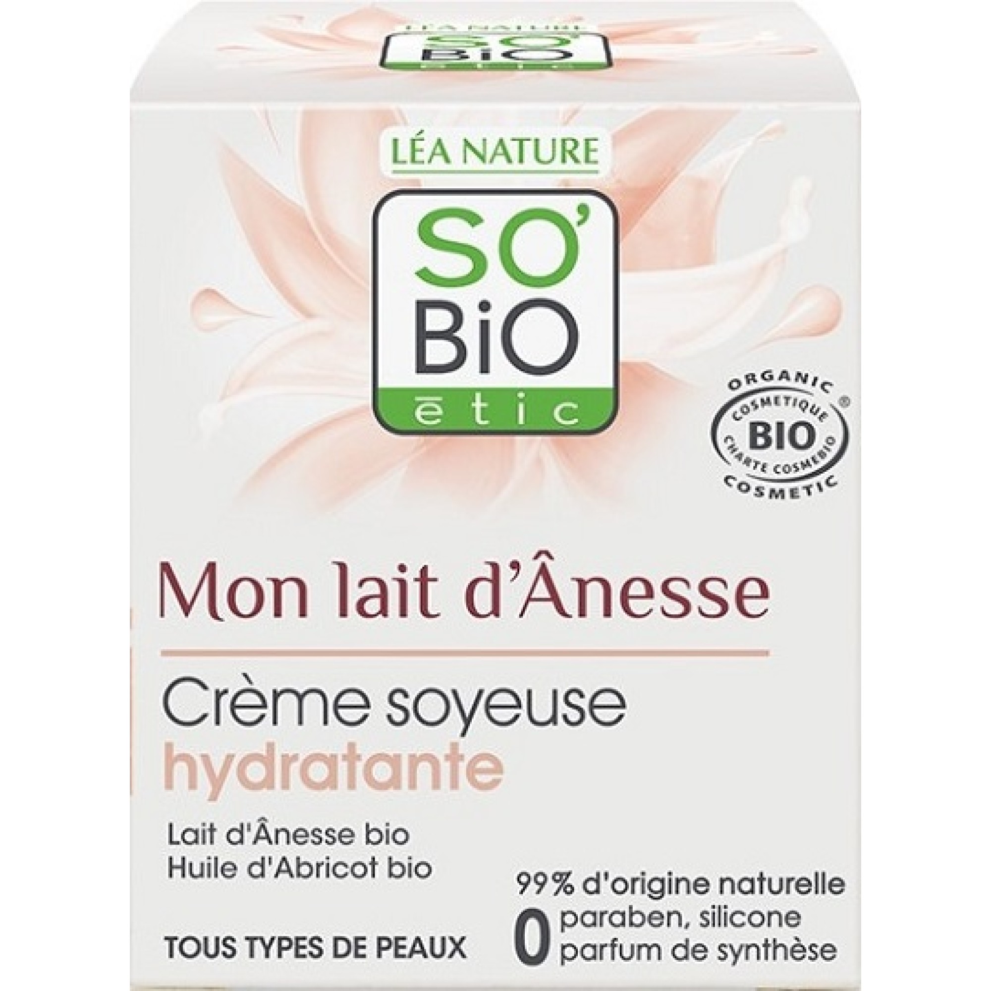 étic +: H σειρά Mon lait d' Anesse περιέχει 100% Γαλλικό οργανικό Γάλα Γαϊδούρας από μια συγκεκριμένη και πιστοποιημένη φάρμα. Επιπλέον η συλλογή του γάλακτος για τα καλλυντικά προϊόντα So Bio γίνεται με τον παραδοσιακό τρόπο με το χέρι ενώ δεν στερεί από τα μικρά γαϊδουράκια το γάλα της μητέρας τους!