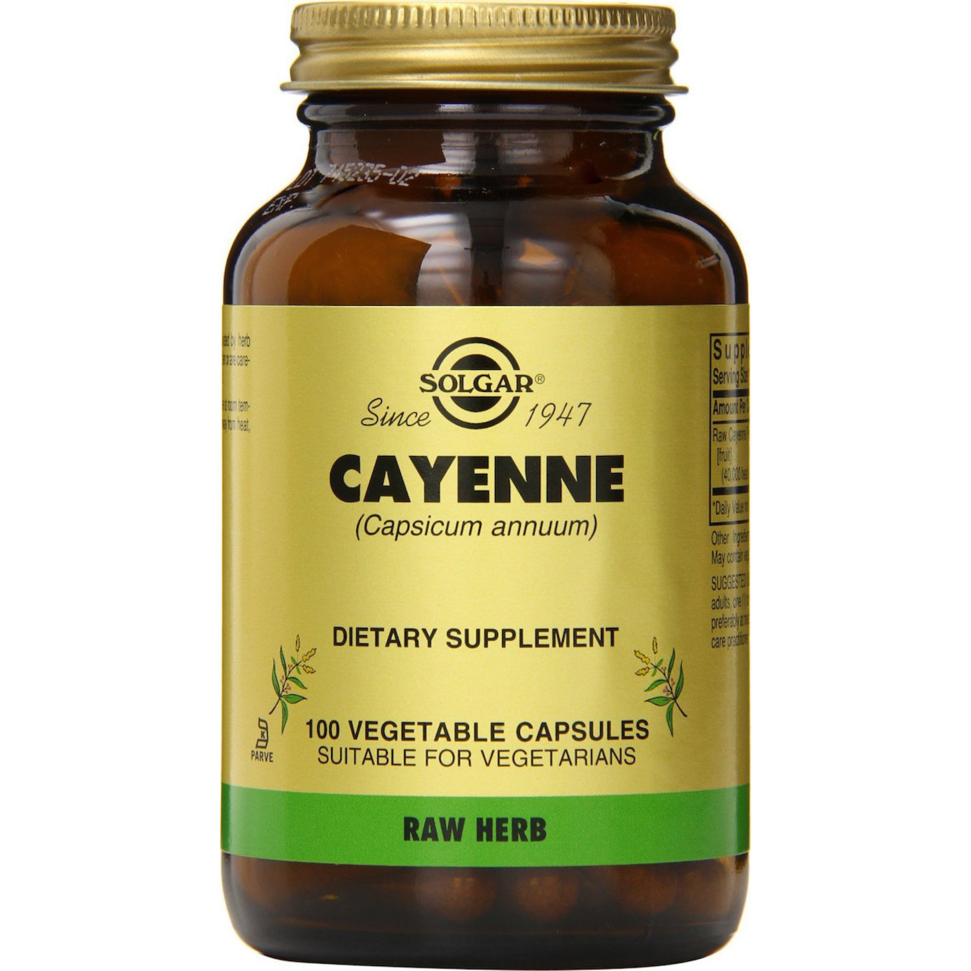 Το συμπλήρωμα διατροφής Cayenne 520mg (Capsicum annuum) της Solgar παρουσιάζει καρδιαγγειακά ωφέλη, ενδυναμώνει την κυκλοφορία του αίματος και έχει επίσης αντιβακτηριακές ιδιότητες, ανακουφίζει τον πόνο και βοηθά στην πέψη. Σε φυτοκάψουλες. Λαμβάνετε 1 φυτοκάψουλα ημερησίως, κατά προτίμηση με τα γεύματα.  Κατάλληλο για vegans.