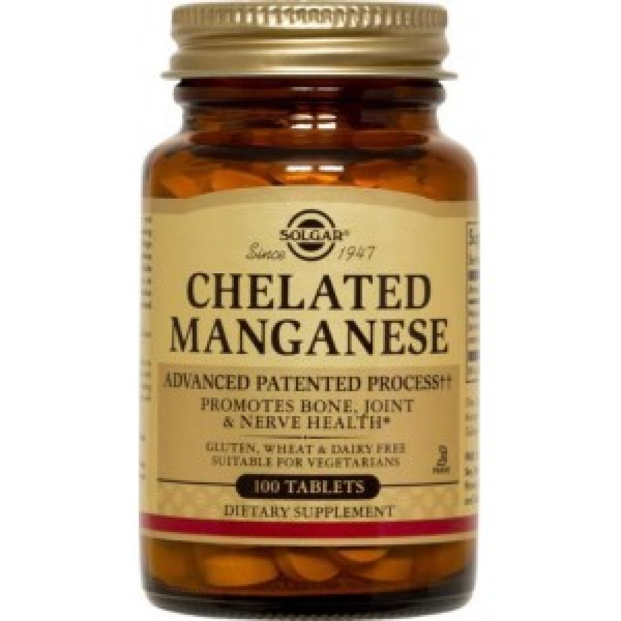 To μαγγάνιο δρα ως συμπαράγοντας σε πολλά ενζυμικά συστήματα, ειδικά σε αυτά που έχουν σχέση με παραγωγή ενέργειας, σχηματισμό οστών, μεταβολισμό των πρωτεϊνών και τη σύνθεση των βλεννοπολυσακχαριτών. Έλλειψή του σχετίζεται με ανωμαλίες των οστών και των χόνδρων, δυσκολίες στη ρύθμιση του σακχάρου του αίματος και αναπαραγωγικές δυσλειτουργίες. Παρασκευασμένο σύμφωνα με την επεξεργασία Albion amino acid chelation. Σε ταμπλέτες. Λαμβάνετε 1 ταμπλέτα ημερησίως κατά προτίμηση με τα γεύματα.  Κατάλληλο για vegans.   ΠΗΓΗ: www.solgar.gr