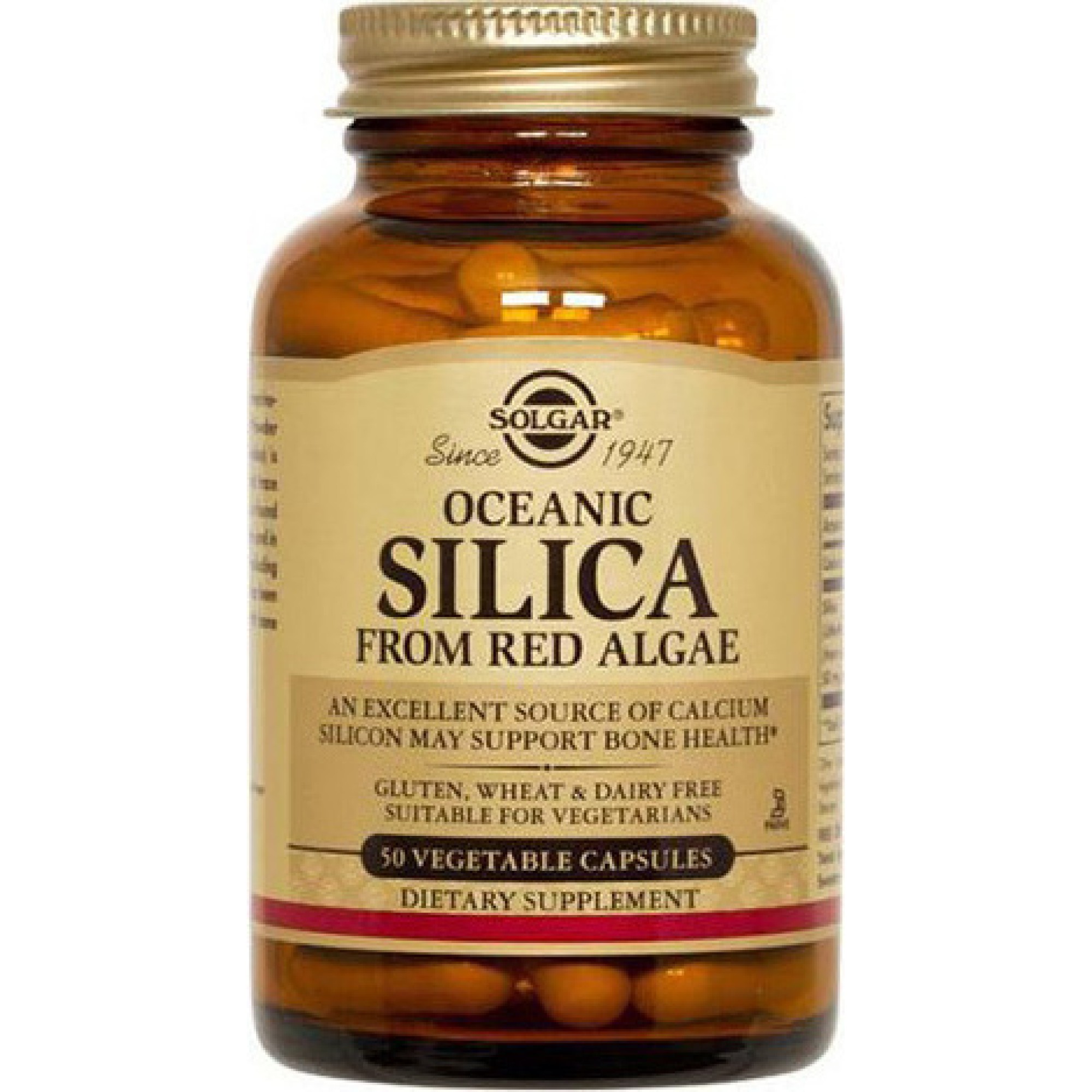 Οργανική πηγή πυριτίου προερχόμενο από κόκκινα άλγη (lithothamnium calcareum). To πυρίτιο βοηθά στην υγεία των οστών, των μαλλιών, του δέρματος, των νυχιών και των δοντιών. Είναι απαραίτητο στον σχηματισμό του συνδετικού ιστού. Σε φυτοκάψουλες. Λαμβάνετε 1-2 φυτοκάψουλες ημερησίως, κατά προτίμηση με τα γεύματα. Κατάλληλο για vegans.   ΠΗΓΗ: www.solgar.gr